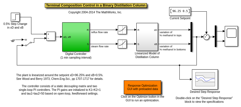 Этот пример показывает, как использовать Simulink® Design Optimization™, чтобы оптимизировать многоконтурные параметры контроллера столбца дистилляции. Столбец Дистилляции производит метанол и представлен как линейная модель с задержками. Цифровой многоконтурный контроллер состоит разъединяющаяся матрица и два одноконтурных контроллера PI. Параметры и одноконтурных контроллеров настраиваются одновременно, чтобы удовлетворить 14-процентное перерегулирование и 13-минутные характеристики переходного процесса времени нарастания.
