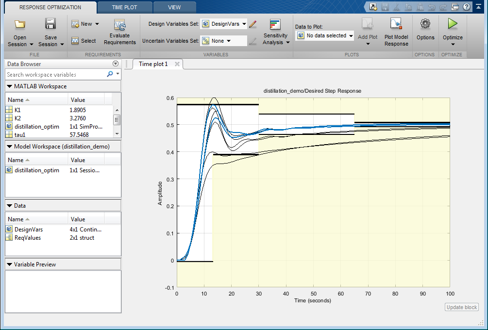 Дважды кликните блок Desired Step Response, чтобы просмотреть ограничения на переходной процесс столбца дистилляции. Эти ограничения используются, чтобы одновременно настроить оба из одноконтурных параметров контроллера.