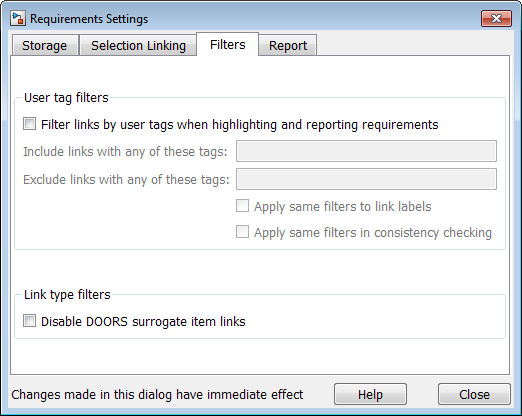 Можно управлять настройками RMI в диалоговом окне Requirements Settings. Эти настройки являются глобальной переменной и не сопоставленные с какой-то конкретной моделью. Чтобы открыть диалоговое окно Requirements Settings, из Редактора Simulink®, выбирают Analysis> Requirements> Settings. В этом диалоговом окне можно выбрать: