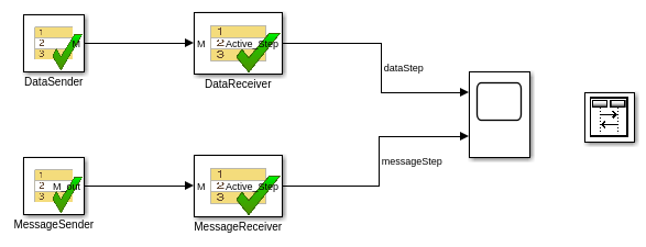 Этот пример демонстрирует вводы и выводы сообщения, отправку и получение сообщения. Модель сравнивает две пары тестовых последовательностей. Каждая пара состоит из отправки и получения тестового блока последовательности. Первая пара отправляет и получает данные, и второе отправляет и получает сообщение.
