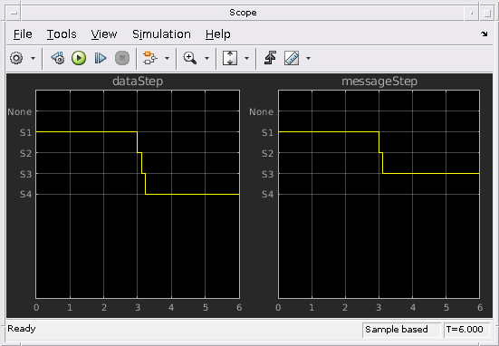Блок DataReceiver ожидает 3 секунды, затем переходы к шагу S2. Переходы шага S2 к шагу S3 с помощью условия, сравнивающего M с ожидаемым значением, и, делают то же самое для S3 к S4.