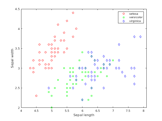 figure; gscatter(X(:,1), X(:,2), species,'rgb','osd'); xlabel('Sepal length'); ylabel('Sepal width');