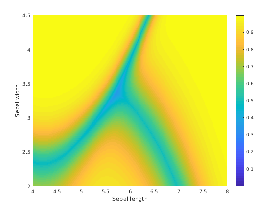 sz = size(xx1); s = max(Posterior,[],2); figure hold on surf(xx1,xx2,reshape(Posterior(:,1),sz),'EdgeColor','none') surf(xx1,xx2,reshape(Posterior(:,2),sz),'EdgeColor','none') surf(xx1,xx2,reshape(Posterior(:,3),sz),'EdgeColor','none') xlabel('Sepal length'); ylabel('Sepal width'); colorbar view(2) hold off