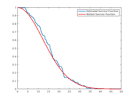 stairs(H(:,1),exp(-H(:,2)),'LineWidth',2) xx = linspace(0,100); line(xx,1-wblcdf(xx,50*exp(-0.5*mean(X)),B),'color','r','LineWidth',2) xlim([0,50]) legend('Estimated Survivor Function','Weibull Survivor Function')