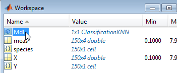 Mdl является обученным классификатором ClassificationKNN, и некоторые его свойства появляются в Командном окне.