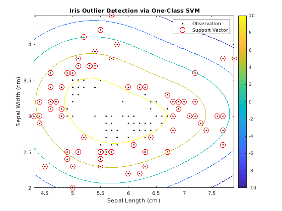 Установите аргумент пары "имя-значение" Nu значению ближе к 0 приводить к меньшему количеству векторов поддержки и, поэтому, более сглаженный, но грубый контур решения.