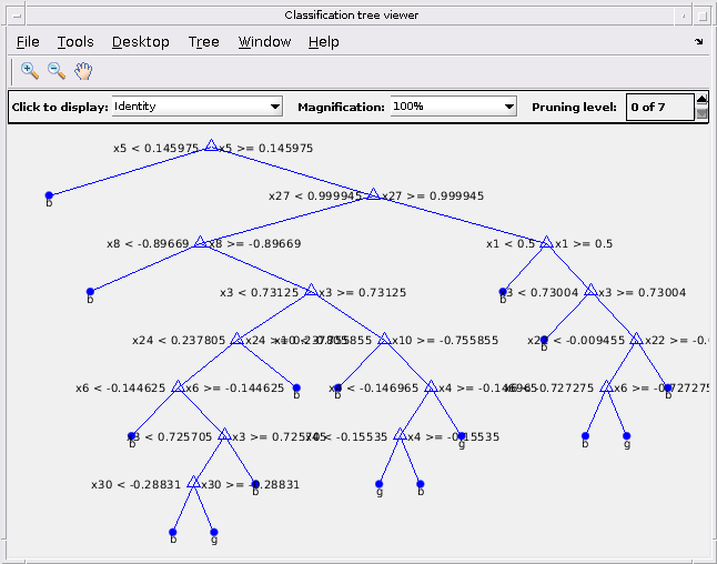 Предположим, что вы хотите дерево классификации, которое не является столь комплексное (глубокий), как те обучили использование количества по умолчанию разделений. Обучите другое дерево классификации, но определите максимальный номер разделений в 7, который является приблизительно половиной среднего количества разделений от дерева классификации по умолчанию. Перекрестный подтвердите модель при помощи 10-кратной перекрестной проверки.