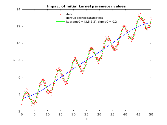 figure(); plot(x,y,'r.'); hold on plot(x,ypred1,'b'); plot(x,ypred2,'g'); xlabel('x'); ylabel('y'); legend({'data','default kernel parameters',... 'kparams0 = [3.5,6.2], sigma0 = 0.2'},... 'Location','Best'); title('Impact of initial kernel parameter values'); hold off