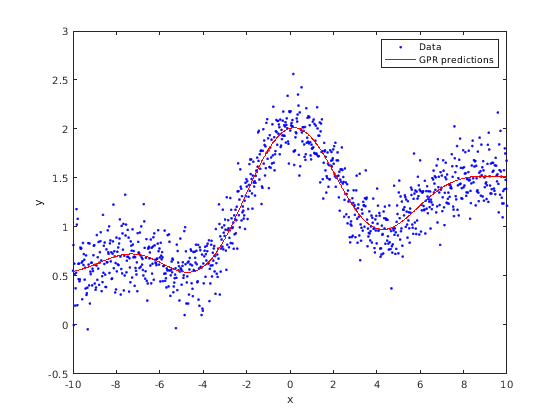 plot(x,y,'b.'); hold on; plot(x,ypred,'r','LineWidth',1.5); xlabel('x'); ylabel('y'); legend('Data','GPR predictions'); hold off