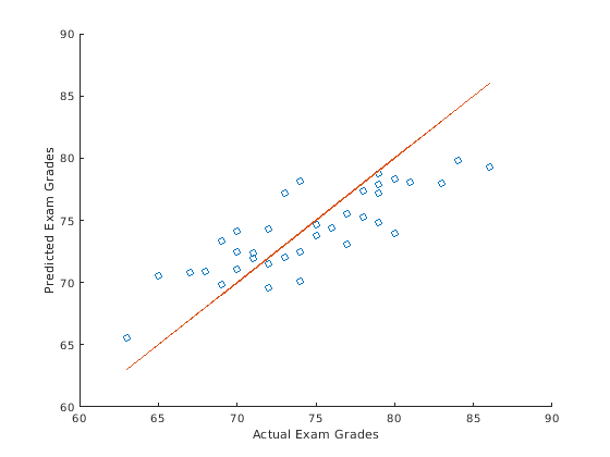 yhat = XTest*coef + coef0; hold on scatter(yTest,yhat) plot(yTest,yTest) xlabel('Actual Exam Grades') ylabel('Predicted Exam Grades') hold off