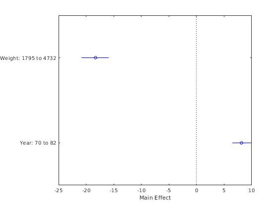 plotEffects(mdl)h = plotEffects(mdl)plotEffects( создает график эффектов предикторов в модели mdl)mdl линейной регрессии. График эффектов показывает предполагаемый основной эффект на ответ от изменения каждого значения предиктора, составляя в среднем эффекты других предикторов. Горизонтальная строка через значение эффекта указывает на 95%-й доверительный интервал для значения эффекта.