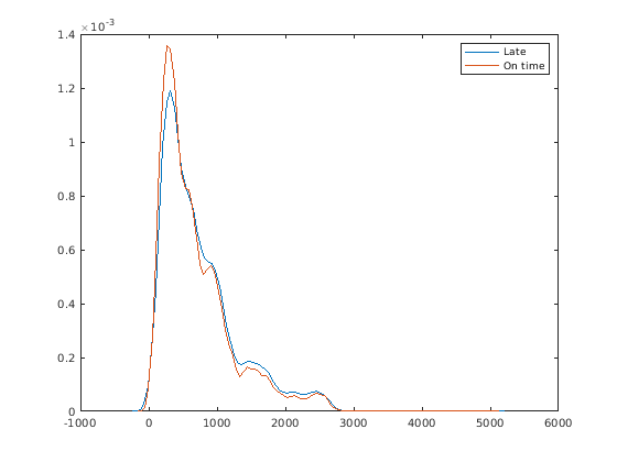 ksdensity(tt.Distance(tt.LateFlight==1)) hold on ksdensity(tt.Distance(tt.LateFlight==0)) hold off legend('Late','On time')
