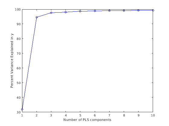 [XL,YL,XS,YS,BETA,PCTVAR] = plsregress(X,Y,ncomp) возвращает 2 ncomp матричным PCTVAR, содержащим процент отклонения, объясненного моделью. Первая строка PCTVAR содержит процент отклонения, объясненного в X каждым компонентом PLEASE, и вторая строка содержит процент отклонения, объясненного в Y.