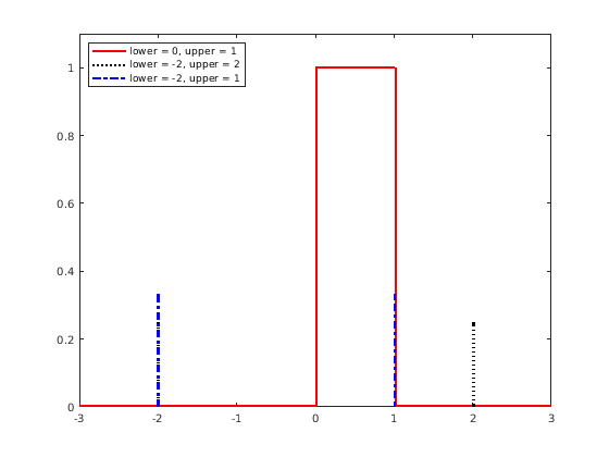% Create three distribution objects with different parameters pd1 = makedist('Uniform'); pd2 = makedist('Uniform','lower',-2,'upper',2); pd3 = makedist('Uniform','lower',-2,'upper',1); % Compute the pdfs x = -3:.01:3; pdf1 = pdf(pd1,x); pdf2 = pdf(pd2,x); pdf3 = pdf(pd3,x); % Plot the pdfs figure; stairs(x,pdf1,'r','LineWidth',2); hold on; stairs(x,pdf2,'k:','LineWidth',2); stairs(x,pdf3,'b-.','LineWidth',2); ylim([0 1.1]); legend({'lower = 0, upper = 1','lower = -2, upper = 2',... 'lower = -2, upper = 1'},'Location','NW'); hold off;