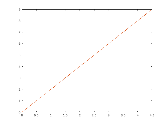 t = 0:0.1:4.5; h1 = exppdf(t,0.8862)./(1-expcdf(t,0.8862)); h2 = wblpdf(t,1,2)./(1-wblcdf(t,1,2)); plot(t,h1,'--',t,h2,'-')