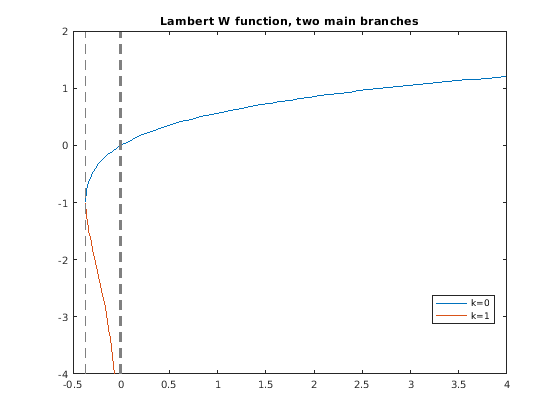 syms x fplot(lambertw(x)) hold on fplot(lambertw(-1,x)) hold off axis([-0.5 4 -4 2]) title('Lambert W function, two main branches') legend('k=0','k=1','Location','best')