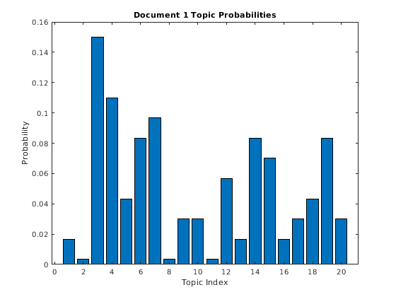 topicMixtures = mdl.DocumentTopicProbabilities; figure bar(topicMixtures(1,:)) title("Document 1 Topic Probabilities") xlabel("Topic Index") ylabel("Probability")