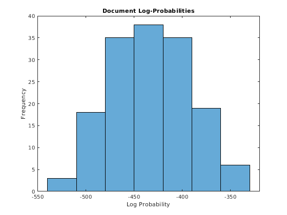 figure histogram(logProbabilities) xlabel("Log Probability") ylabel("Frequency") title("Document Log-Probabilities")