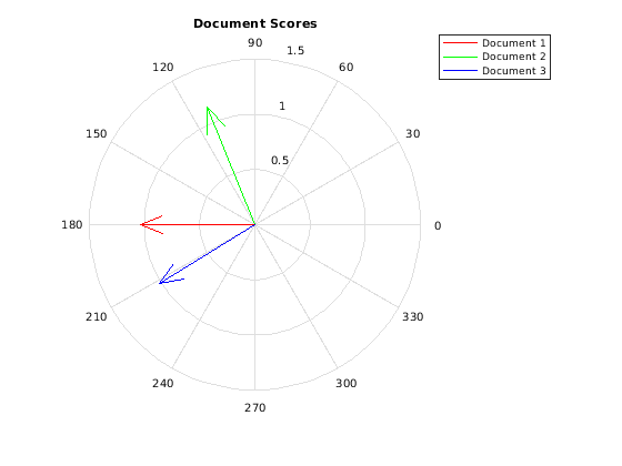 figure compass(dscores(1,1),dscores(1,2),'red') hold on compass(dscores(2,1),dscores(2,2),'green') compass(dscores(3,1),dscores(3,2),'blue') hold off title("Document Scores") legend(["Document 1" "Document 2" "Document 3"],'Location','bestoutside')