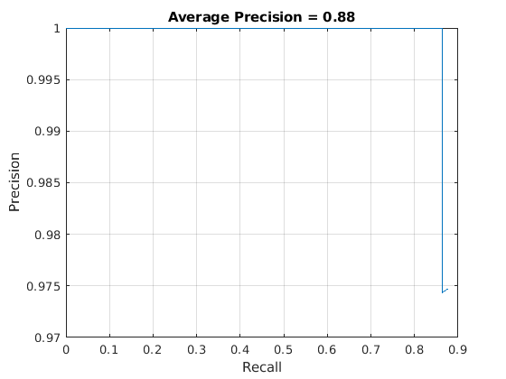% Plot precision/recall curve figure plot(recall,precision) xlabel('Recall') ylabel('Precision') grid on title(sprintf('Average Precision = %.2f', ap))