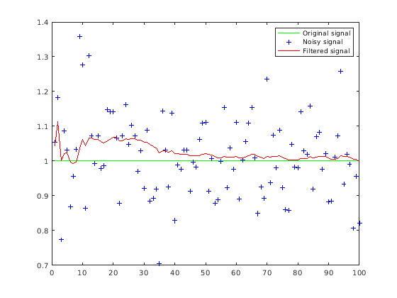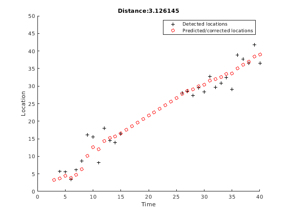 Используйте функцию distance, чтобы найти лучшие соответствия. Вычисленные значения расстояния описывают, как набор измерений совпадает с Фильтром Калмана. Можно таким образом выбрать измерение что лучшие подгонки фильтр. Эта стратегия может использоваться для обнаружений соответствующего объекта против объектных дорожек в проблеме отслеживания мультиобъекта. Это вычисление расстояния учитывает ковариацию предсказанного состояния и шума процесса.