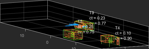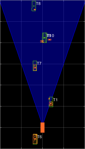 Анимация выше показов симуляция между временем = 3 секунды и временем = 16 секунд. Заметьте, что дорожки, такие как T9 и T6 поддерживают свои идентификаторы и траекторию во время отрезка времени. Однако отследите T10, потерян, потому что гусеничная машина ушлась (не обнаруженный) в течение долгого времени датчиком. Кроме того, заметьте, что отслеживаемые объекты могут поддержать свою форму и кинематический центр путем расположения обнаружений на видимые фрагменты автомобилей. Например, как Дорожка T7 продвигается, обнаружения ограничительной рамки начинают падать на ее видимый задний фрагмент, и дорожка поддерживает фактический размер автомобиля. Это иллюстрирует эффект смещения и уменьшения, смоделированный в функциях измерения.