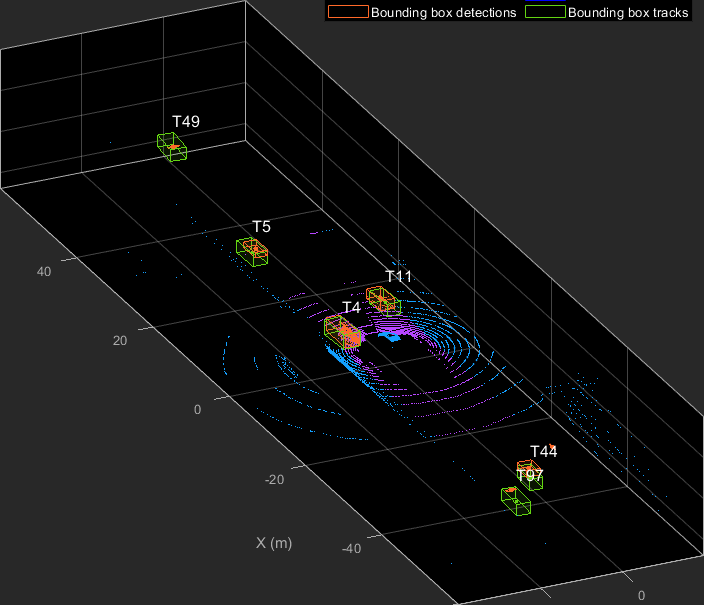 Цикл через записанные данные о лазерном дальномере, сгенерируйте обнаружения от облака текущей точки с помощью модели детектора и затем обработайте обнаружения с помощью средства отслеживания.