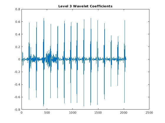 При взятии MODWT сигнала длины , существуют - много уровней разложения (по умолчанию). Коэффициенты детали производятся на каждом уровне. Масштабные коэффициенты возвращены только для итогового уровня. В этом примере, с тех пор , и количество строк в wtecg .