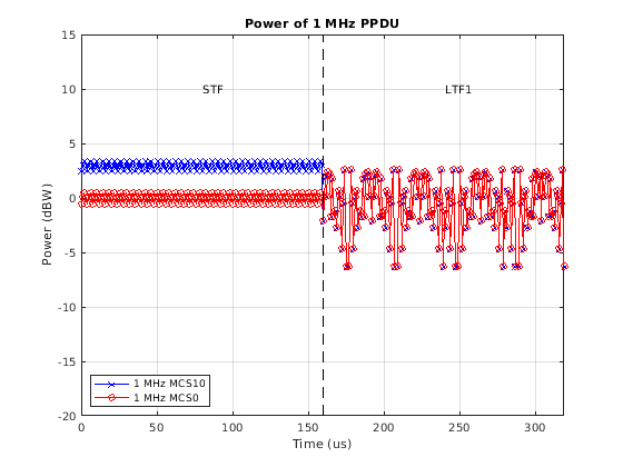 Степень построена в течение первых 320 микросекунд обеих форм волны, чтобы получить длительность STF и первого LTF в передаче на 1 МГц. Отметьте повышение степени STF, когда MCS10 будет использоваться. Повышение степени требуется, чтобы получать достаточную пакетную чувствительность обнаружения, чтобы поддержать MCS10 [2].