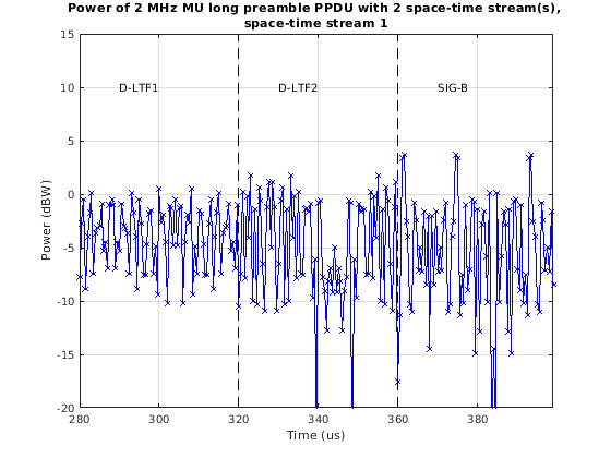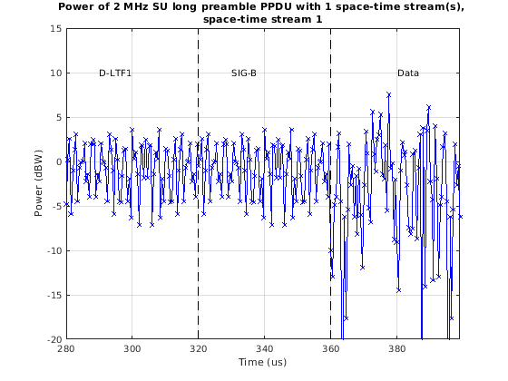 t = 320; % Duration to plot in microseconds sr = wlanSampleRate(cfg1MHz); % Sample rate Hz tick = (1/sr)*1e6; % Microseconds per sample hf = figure; hp(1) = plot(0:tick:t-tick,20*log10(abs(txMCS10(1:t*sr*1e-6,:))),'bx-'); hold on; hp(2) = plot(0:tick:t-tick,20*log10(abs(txMCS0(1:t*sr*1e-6,:))),'ro-'); xlim([0 t-1]); ylim([-20 15]); s1gWavGenPlotFieldOverlay(cfg1MHz,hf); grid on; legend(hp,'1 MHz MCS10','1 MHz MCS0','Location','SouthWest'); title('Power of 1 MHz PPDU'); xlabel('Time (us)'); ylabel('Power (dBW)');