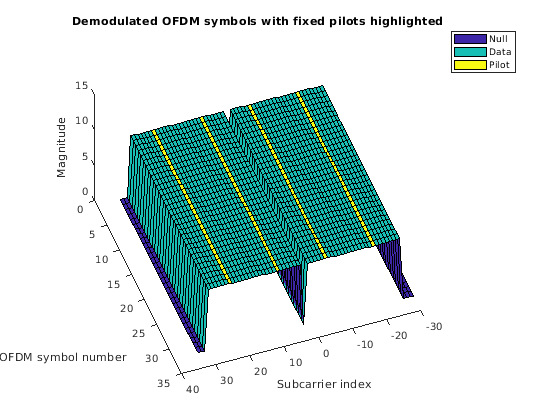 s1gWavGenPlotGrid(txTravel,cfgTravel, ... 'Demodulated OFDM symbols with traveling pilots highlighted')