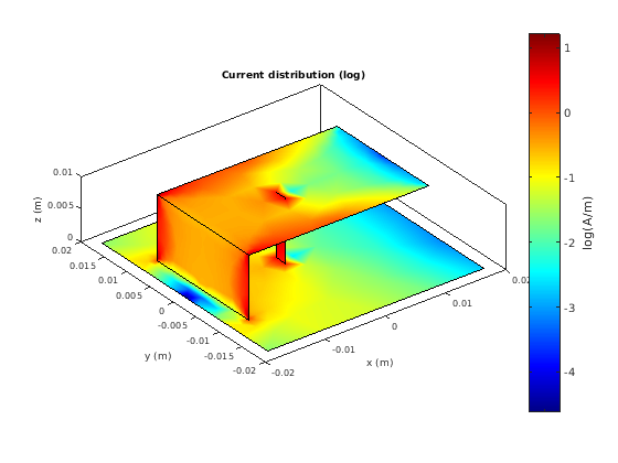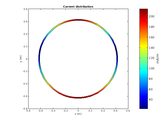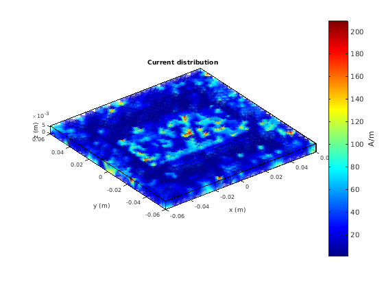 x, y, компоненты z распределения тока, возвращенного как 3 n, объединяют матрицу в A/m. Значение тока вычисляется на каждую треугольную mesh или каждую диэлектрическую поверхность четырехгранника на поверхности антенны или массива.