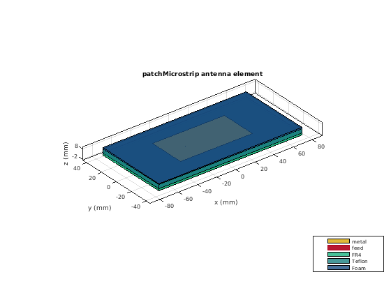 sub = dielectric('Name',{'FR4','Teflon','Foam'},'EpsilonR',... [4.80 2.10 1.03],'Thickness',[0.002 0.004 0.001],... 'LossTangent',[0.0260 2e-04 1.5e-04]);
