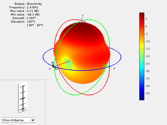 создает Яги-Uda полудлины волны пользовательская антенна массивов вдоль оси Z. Антенна по умолчанию взволнована с помощью диполя и состоит из трех директоров и одного отражателя. Размерности по умолчанию выбраны для рабочей частоты 2,4 ГГц.ant = quadCustom