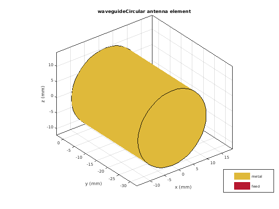 создает круговой волновод с размерностями для рабочей частоты 8,42 ГГц.ant = waveguideCircular