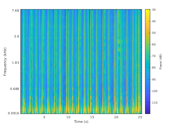 [audioIn,fs] = audioread('FunkyDrums-44p1-stereo-25secs.mp3'); S = melSpectrogram(audioIn,fs, ... 'WindowLength',2048,... 'OverlapLength',1024, ... 'FFTLength',4096, ... 'NumBands',64, ... 'FrequencyRange',[62.5,8e3]);