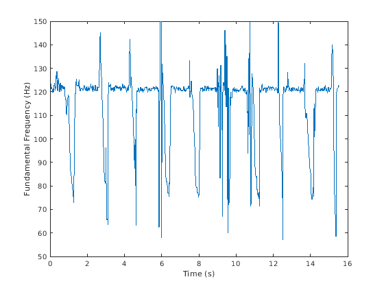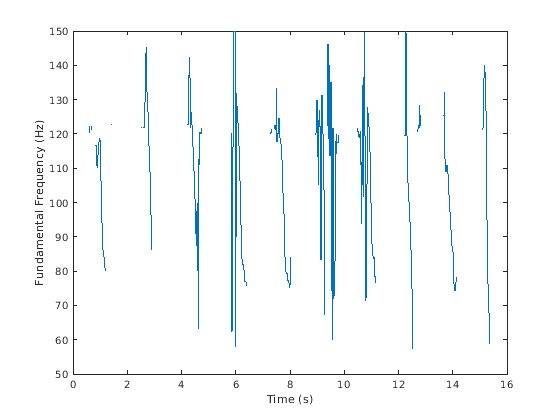 Задайте обнаружение подачи с помощью длины окна на 50 мс и перекрытия на 40 мс (транзитный участок на 10 мс). Укажите что pitch функционируйте ищет основную частоту в области значений 50-150 Гц и постобрабатывает результаты со средним фильтром. Постройте график результатов.