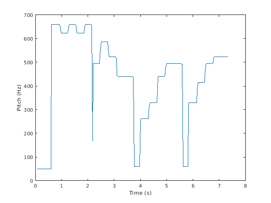 Загрузите звуковой файл введения в Фюр Элис и частоту дискретизации аудио. Вызовите pitch функция с помощью подачи оценивает фильтр (PEF), поисковый диапазон от 50 Гц до 800 Гц, длина окна 80 мс и перекрытие 50 мс. Постройте результаты и слушайте песню, чтобы проверить основные оценки частоты, возвращенные pitch функция.