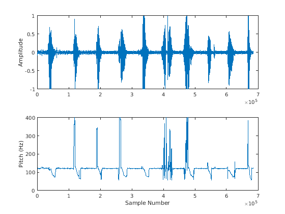pitch функциональные сегменты аудиовход согласно WindowLength и OverlapLength аргументы. Основная частота оценивается для каждой системы координат. Местоположения выход, loc содержит новые выборки (самые большие демонстрационные числа) соответствующей системы координат.