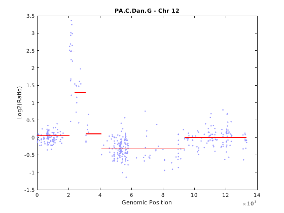 PS = cghcbs(pancrea_data, 'SampleInd', sampleIndex, ... 'Chromosome', chromID, 'ShowPlot', chromID); ylim(gca, ylims)