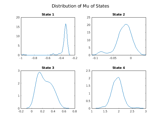 figure; for j = 1:NS subplot(2,2,j) ksdensity(mus(j,:)); title(sprintf('State %d', j)) end suptitle('Distribution of Mu of States'); hold off;
