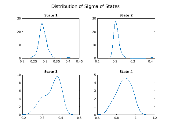 figure; for j = 1:NS subplot(2,2,j) ksdensity(sigmas(j,:)); title(sprintf('State %d', j)) end suptitle('Distribution of Sigma of States'); hold off;