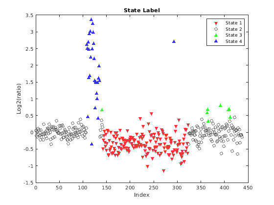 figure; leg = zeros(1,4); for i = 1:N if clone_states(i) == 1 leg(1) = plot(i,Y(i),'v', 'MarkerFaceColor', [1 0.2 0.2],... 'MarkerEdgeColor', 'none'); elseif clone_states(i) == 2 leg(2) = plot(i,Y(i),'o', 'Color', [0.4 0.4 0.4]); elseif clone_states(i) == 3 leg(3) = plot(i,Y(i),'^', 'MarkerFaceColor', [0.2 1 0.2],... 'MarkerEdgeColor', 'none'); elseif clone_states(i) == 4 leg(4) = plot(i, Y(i), '^', 'MarkerFaceColor', [0.2 0.2 1],... 'MarkerEdgeColor', 'none'); end hold on; end ylim(gca, ylims) legend(leg, 'State 1', 'State 2','State 3','State 4') xlabel('Index') ylabel('Log2(ratio)') title('State Label') hold off