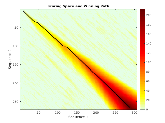 Теперь выполните локальное выравнивание с алгоритмом Смита-лодочника. MATLAB использует BLOSUM 50 в качестве матрицы выигрыша значения по умолчанию для строк AA со штрафом разрыва 8. Конечно, можно изменить любой из этих параметров.