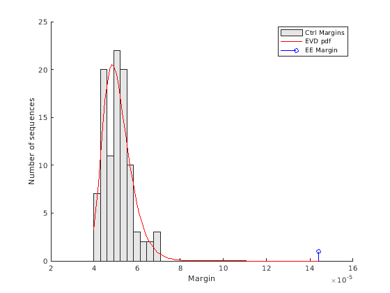 % === estimate parameters of distribution nCtrl = length(ctrlMargin); buckets = ceil(nCtrl/10); parmhat = gevfit(ctrlMargin); k = parmhat(1); % shape parameter sigma = parmhat(2); % scale parameter mu = parmhat(3); % location parameter % === compute probability density function x = linspace(min(ctrlMargin), max([ctrlMargin EEMargin])); y = gevpdf(x, k, sigma, mu); % === scale probability density function [v, c] = hist(ctrlMargin,buckets); binWidth = c(2) - c(1); scaleFactor = nCtrl * binWidth; % === overlay figure() hold on; hist(ctrlMargin, buckets); h = findobj(gca,'Type','patch'); h.FaceColor = [.9 .9 .9]; plot(x, scaleFactor * y, 'r'); stem(EEMargin, 1, 'b'); xlabel('Margin'); ylabel('Number of sequences'); legend('Ctrl Margins', 'EVD pdf', 'EE Margin');