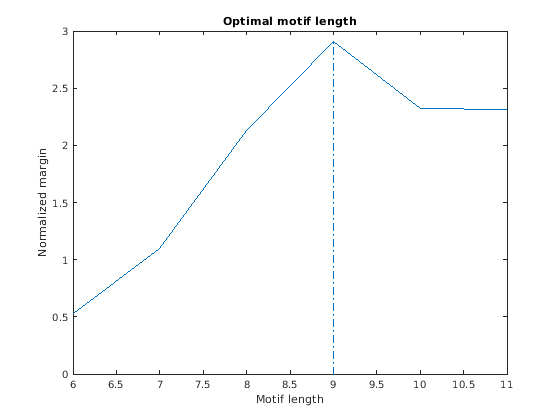 % === top over-represented words, W = 6...11 in set 2 (evening) topMotif topMargin % === top over-represented words, W = 6...11 in random set rTopMotif rTopMargin % === compute score score = topMargin ./ rTopMargin; [bestScore, bestLength] = max(score); % === plot figure() plot(6:11, score(6:11)); xlabel('Motif length'); ylabel('Normalized margin'); title('Optimal motif length'); hold on line([bestLength bestLength], [0 bestScore], 'LineStyle', '-.')