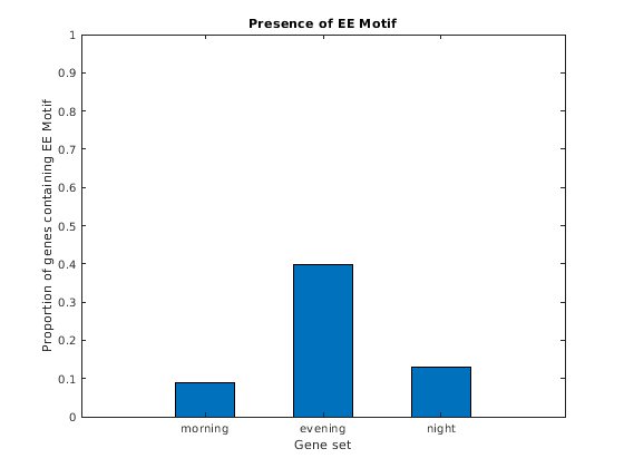 EECount = zeros(3,1); % === determine positions where EE motif occurs loc1 = strfind(seq1, EEMotif); loc2 = strfind(seq2, EEMotif); loc3 = strfind(seq3, EEMotif); % === count occurrences EECount(1) = length(loc1); EECount(2) = length(loc2); EECount(3) = length(loc3); % === find proportions of genes with EE Motif NumGenes = [N1; N2; N3] / 2; EEProp = EECount ./ NumGenes; % === plot figure() bar(EEProp, 0.5); ylabel('Proportion of genes containing EE Motif'); xlabel('Gene set'); title('Presence of EE Motif'); ylim([0 1]) ax = gca; ax.XTickLabel = {'morning', 'evening', 'night'};