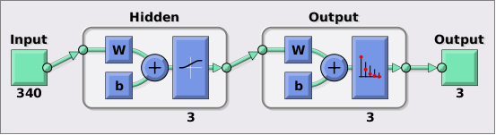Проблема вторичного прогноза структуры может считаться проблемой распознавания образов, где сеть обучена, чтобы распознать структурное состояние центрального остатка, скорее всего, чтобы произойти, когда определенные остатки в данном раздвижном окне наблюдаются. Мы создаем нейронную сеть распознавания образов с помощью входа и предназначаемся для матриц, заданных выше и задавая скрытый слой размера 3.