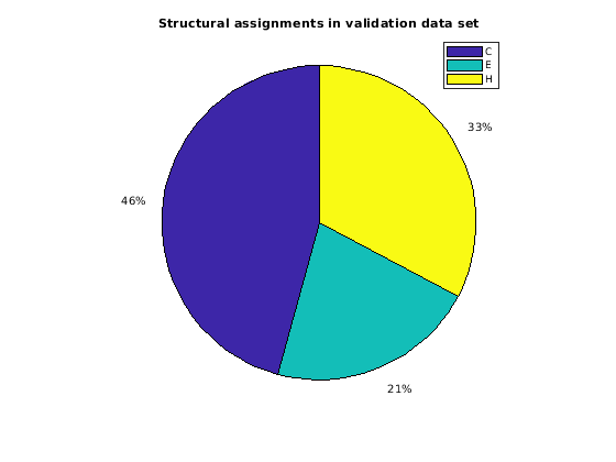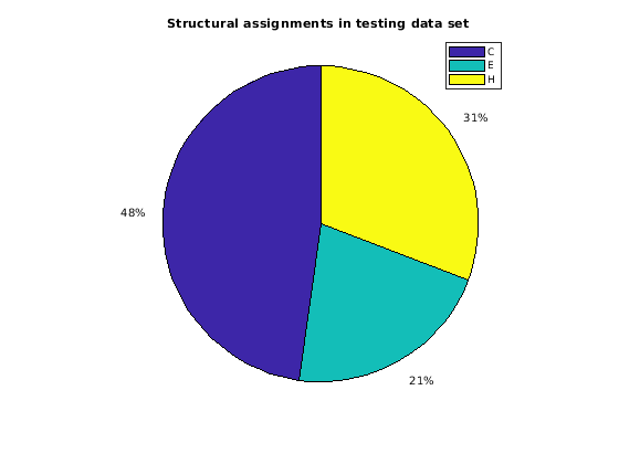 [i,j] = find(T(:,tr.trainInd)); Ctrain = sum(i == 1)/length(i); Etrain = sum(i == 2)/length(i); Htrain = sum(i == 3)/length(i); [i,j] = find(T(:,tr.valInd)); Cval = sum(i == 1)/length(i); Eval = sum(i == 2)/length(i); Hval = sum(i == 3)/length(i); [i,j] = find(T(:,tr.testInd)); Ctest = sum(i == 1)/length(i); Etest = sum(i == 2)/length(i); Htest = sum(i == 3)/length(i); figure() pie([Ctrain; Etrain; Htrain]); title('Structural assignments in training data set'); legend('C', 'E', 'H') figure() pie([Cval; Eval; Hval]); title('Structural assignments in validation data set'); legend('C', 'E', 'H') figure() pie([Ctest; Etest; Htest]); title('Structural assignments in testing data set '); legend('C', 'E', 'H')