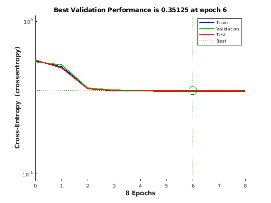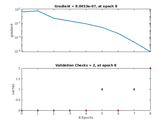 Учебный процесс останавливается, когда одно из нескольких условий (см. net.trainParam) соответствуется. Например, в рассмотренном обучении, учебный процесс останавливается, когда ошибочные увеличения валидации для конкретного количества итераций (6) или максимальное количество позволенных итераций достигнуты (1000).